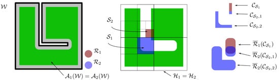 We note that a cover partitions into a set of regions each of which consists of zero or more individually connected but pairwise disjoint subsets , which shall be referred to as workspace (or simple) cells. A cover of the configuration space is, respectively, defined by assigning a cover to each robot. Accordingly, a configuration space (or compound) slice is defined as , where is a set of simple slices. Likewise, a configuration space cover induces a partitioning of into regions , where is an element of . We note that each of these regions may consist of zero or more individually connected but pairwise disjoint subsets , which shall be referred to herein as configuration space (or compound) cells. Given the compound cell , we will use to denote its j-th component, i.e., , for all . We remark that, unlike hierarchical decomposition schemes commonly encountered in the literature, which use cells of simple geometries (e.g., hypercubes or hyperrectangles), the configuration space cells considered in this work have, in general, arbitrary geometries because their components do not possess a pre-specified shape (see Figure 3). Although this choice renders navigation within a cell more complicated, it generally results in coarser partitions because because each component of belongs in by construction; thus, the subdivision scheme has to accommodate only for potential inter-robot collisions.