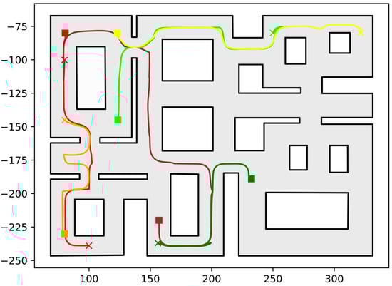 Executed trajectories of the six-robot case. Squares indicate initial positions, whereas the corresponding goal positions are depicted using crosses. Robot #1 (red); Robot #2 (green); Robot #3 (dark red); Robot #4 (orange); Robot #5 (yellow); Robot #6 (dark green). The axes units are in (dm).