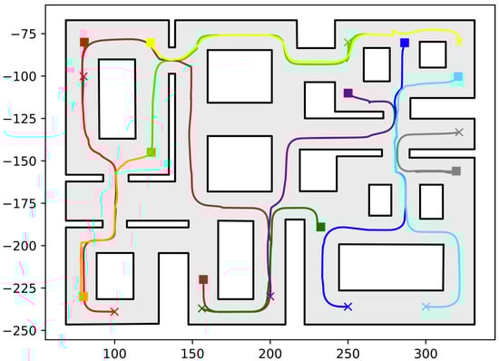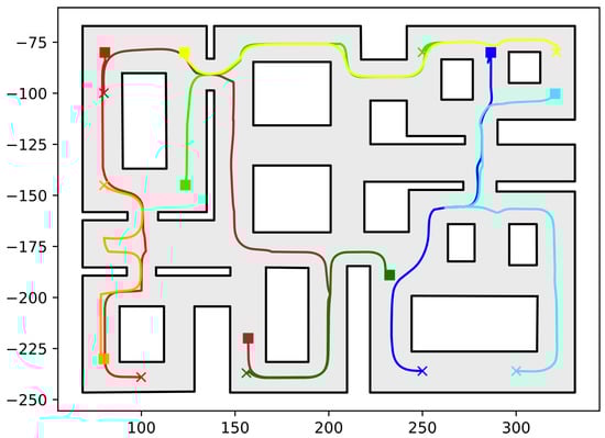 Executed trajectories of the ten-robot case. Squares indicate initial positions, whereas the corresponding goal positions are depicted using crosses. Robot #1 (red); Robot #2 (green); Robot #3 (dark red); Robot #4 (orange); Robot #5 (yellow); Robot #6 (dark green); Robot #7 (blue); Robot #8 (cyan); Robot #9 (purple); Robot #10 (grey). The axes units are in (dm).