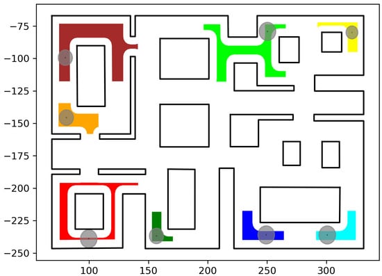 The initial robot positions and calculated initial compound cell . Robot #1 (red); Robot #2 (green); Robot #3 (dark red); Robot #4 (orange); Robot #5 (yellow); Robot #6 (dark green); Robot #7 (blue); Robot #8 (cyan). The axes units are in (dm).