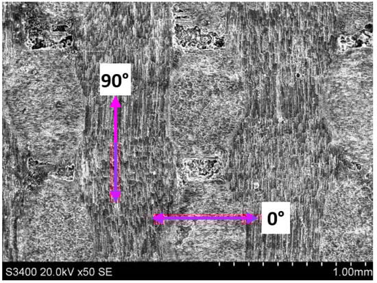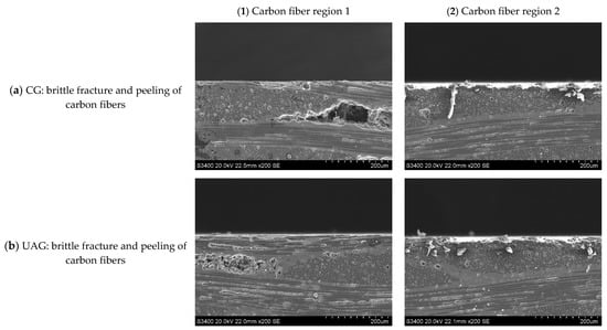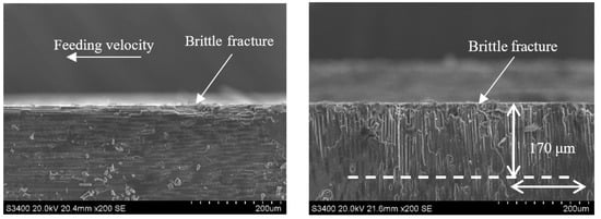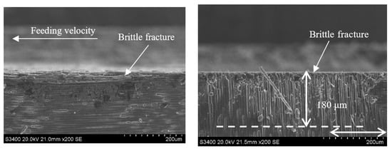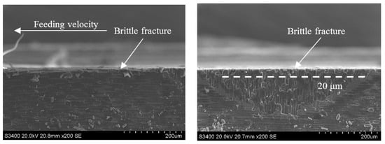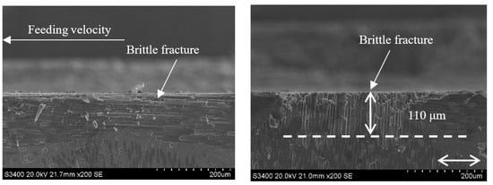 Figure 14 and Figure 15 show the subsurface topographies after common grinding and ultrasonic vibration-assisted grinding under the conditions of vs = 1.26 m/s, ap = 0.1 mm, and vw = 100 m/min. After CG and UAG processing, the main damage patterns in the 0° carbon fiber zone are brittle fracture and cracking at the edge. By comparison, it can be seen that the two methods have no obvious influence on the damage size of the 0° carbon fiber bundle. However, in the 90° carbon fiber region, the brittle fracture depth decreases from 170 μm in CG processing to 110 μm in UAG processing. The damage depth, number of brittle faults, and section quality of UAG processing were significantly better than those of CG processing. This is mainly due to the superposition of ultrasonic vibration, which increases the grinding distance, reduces the time of the grinding edge to contact the material, reduces the grinding force, and effectively reduces the damage depth and damage range.