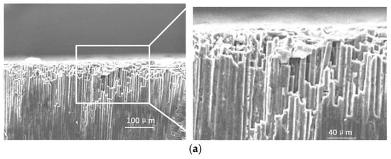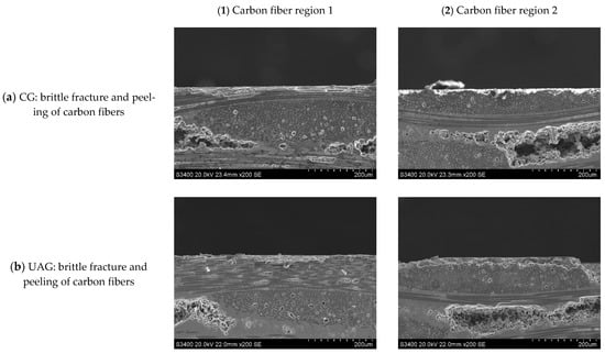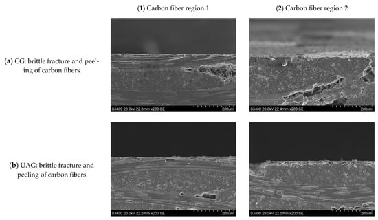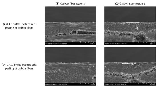 Comparing Figure 14 with Figure 18 and Figure 15 with Figure 19 demonstrates that under the conditions of vs = 1.26 m/s and vw = 100 m/min, when the grinding depth ap is increased from 0.1 mm to 0.4 mm, the size of the damage in the carbon fiber region perpendicular to the feeding direction generated by each method increases from 170 μm and 110 μm to 200 μm and 160 μm, respectively. This is because, when the grinding depth is small, the disbonding between the fibers and the substrate on the grinding surface of the material is limited to a relatively regular range. The grinding surface of the material is relatively flat, only a few layers of fibers are cut by the abrasive particles, the fracture sweep scope is small, and the fracture is relatively neat. With the increase of grinding depth, there are obvious cracks between the fiber bundles, the larger the crack area and the longer the crack propagation length, the phenomenon of fiber delamination is very obvious. By comparing Figure 18 and Figure 19, it can be seen that the damage of CG is more obvious, and the fibers in the 90° direction show severe delamination and zigzag defects, which are more prominent than that when ap = 0.1 mm. This difference is mainly due to the periodical vibration change of cutting depth caused by ultrasonic vibration, and the impact accelerates the rapid breaking and removal of surface materials. Thus, the subsurface damage does not change dramatically after the cut depth increases obviously, which is also the advantage of ultrasonic vibration grinding.