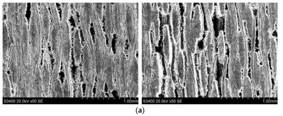 Figure 13 shows the typical surface micromorphology of the side face of the C/SiC composite after common grinding and ultrasonic vibration-assisted grinding. As can be seen from Figure 13a, there is little difference in pore size and shape between the two. As can be seen from Figure 13b, the CG machining surface is more densely fractured and layered, and there are obvious fiber pulling defects in the position shown in the frame. As can be seen from Figure 13c, CG processing presents relatively prominent step fracture and stratification features. According to the comparison between CG and UAG processing under these parameters, the fracture size at the fiber braided Angle, the step fracture size of carbon fiber and the brittle fracture size of SiC in UAG processing are slightly better than those in CG processing, but in general, there is no significant difference between them.