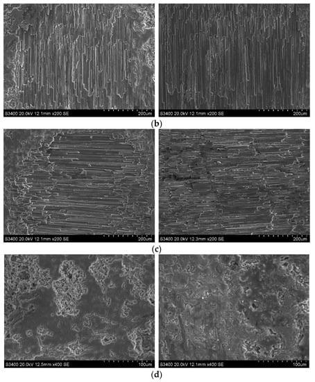 Figure 12 shows the end face micromorphology of the C/SiC composite after typical common grinding and ultrasonic vibration-assisted grinding (vs = 12.6 m/s, ap = 0.1 mm, vw = 0.05 m/min). The figure demonstrates that the pore morphology and SiC region morphology after common grinding and ultrasonic vibration-assisted grinding are not substantially different, but the fiber fracture trend diminishes. As can be seen from Figure 12b, during 0° grinding, the overall grinding surface of CG machining presents layered fractures with multiple layers, irregular machining edges, and large damage, and material breaking defects appear in the picture frame. However, UAG processing has less stratification, a more regular edge, and less local damage. As can be seen from Figure 12c, during 90° grinding, the morphology of CG machining and UAG machining is significantly different. The fiber fracture layers of the CG machining surface frame are significantly more than that of UAG machining, showing a multi-layered ladder shape with 6–7 layers. However, UAG processing presents a smooth overall shape, less stratification, and less edge damage. As can be seen from Figure 12d, the SiC region processed by CG is obviously characterized by large size, deep depth, and visible cracks on the surface, and the machining damage is more obvious than that in UAG processing.