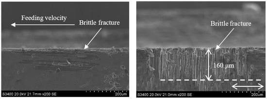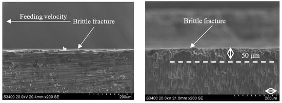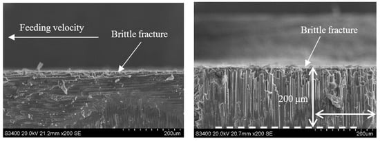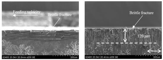 The main subsurface damage of side face grinding is a brittle fracture of the matrix, crack propagation, brittle fracture and spalling of carbon fiber, etc. As shown in Figure 11a, under the influence of interaction between abrasive particles and matrix materials, impact force, and transverse and longitudinal crack propagation caused by surface defects such as carbon fiber pulling out, the SiC region on the subsurface presents the characteristics of brittle fracture with very irregular section. As the crack grows and the material is taken out by the abrasive particles, the brittle fracture characteristics are banded. As can be seen in Figure 11b, brittle fracture occurred on the carbon fiber at the edge of the material, which was mainly due to the fact that the carbon fiber in the subsurface layer was subjected to shear and extrusion at the same time and was in a state of stress concentration under the action of abrasive cutting. When the internal stress of the material exceeds the tensile strength of the material, the fiber fracture occurs at the stress concentration position. While the fiber spalling in the middle is mainly caused by the fact that the shear resistance of carbon fiber is weaker than that of SiC matrix during the normal grinding along the fiber. During the grinding of C/SiC composite material, the carbon fiber is taken out by the cutting edge and separated from the matrix, and the holes caused by fiber spalling appear on the machining surface.