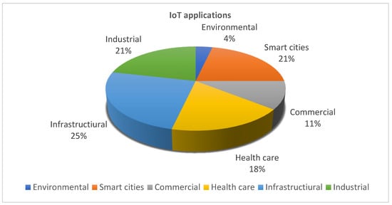 Figure 5 shows the percentage of practical applications of the IoT, and Section 4 explains this in more depth. The six main applications of the IoT include healthcare, the environment, commerce, the smart city, industry, and infrastructure. Each has sub-sections and sub-sections, as shown in the previous figure. According to the reviewed articles, the infrastructure has the highest percentage of application domains, with 25%. Industrial and smart city applications each account for 21%, healthcare applications for 18%, business applications for 11%, and environmental applications for 4%.