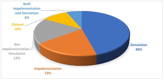 According to the percentages in Figure 6, 19% of the articles proved their point of view through implementation. We also see that 46% of the articles used simulation tools to evaluate the studies presented. In addition, 19% of the articles lacked implementation or simulation for their work, while 6% included both. Finally, it is observed that 10% of the present articles used datasets to evaluate the articles.