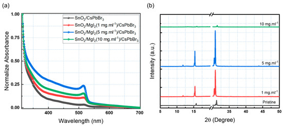 MgI2 solution ratios of 1, 5, and 10 mg·mL−1 were used to investigate the ETL/perovskite interface modification. Mg2+ and I− ions effectively inhibit the formation of deep trap states at the ETL/perovskite interface, promoting surface passivation and decreasing device carrier recombination. Mg2+ ions can also diffuse into the interstitial regions of the perovskite lattice, resulting in an active passivation action [21,24,27]. The UV-Vis absorption technique was used to investigate the optical properties of CsPbBr3 films with and without MgI2 treatment. As shown in Figure 3a, all samples had a sharp absorption edge of around 530 nm. Because of the absorption property of the CsPbBr3 films, they can be used as an active layer for visible photo-detection, particularly in the green light region. The MgI2 layer improved the absorption of the perovskite films, implying that the interface between the ETL and the perovskite was effectively modified. Further research was carried out to determine the effect of the interfacial modifier on the crystal quality of the inorganic CsPbBr3 perovskite. The crystallinity of the perovskite films was investigated using X-ray diffraction (XRD). Figure 3b depicts the XRD patterns of CsPbBr3 perovskite films on PET substrates. The XRD pattern’s break region attempts to remove the strong diffraction from the PET substrate. Because PET flexible substrates were used, the inorganic perovskite annealing temperature was kept constant at 105 °C. The intensities of the peaks increased as MgI2 concentration increased, indicating that the films were more crystalline. The XRD pattern of CsPbBr3 perovskite shows strong and prominent peaks with a high degree of crystallinity, which is beneficial for efficient charge transfer. Higher crystallinity, as well as larger grain size with fewer grain boundaries, are both indicated by a narrower and stronger X-ray diffraction peak, which is directly related to photovoltaic performance. Crystallinity was increased in thin films with 1 and 5 mg·mL−1 additions.