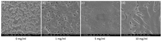 SEM images of the obtained CsPbBr3 films with and without the addition of MgI2 at various concentrations were compared. The pristine CsPbBr3 film has some discontinuities and numerous pinholes, as shown in Figure 4. The film morphology significantly improves as the MgI2 concentration increases, with greater coverage uniformity and fewer minor pinholes. The thin film with a MgI2 concentration of 5 mg·mL−1 appears to have the best film coverage, with very compact grain boundaries and few pinholes. The films with a concentration of 10 mg·mL−1 showed signs of degradation, including poor film coverage and dissolved grain boundaries. The degradation of the films with a higher concentration of MgI2 may indicate saturation of the Mg layer, which prevents the perovskite layer from crystallizing properly. The disproportional addition of the compound can disbalance the perovskite crystallization, leading to an incomplete reaction and the formation of PbI2, preventing the full development of perovskite crystals on the film [23,43,44,45]. The SEM results agree with the UV-Vis and XRD characterization, indicating that adding MgI2 can help improve the morphology and crystallization of the CsPbBr3 film.