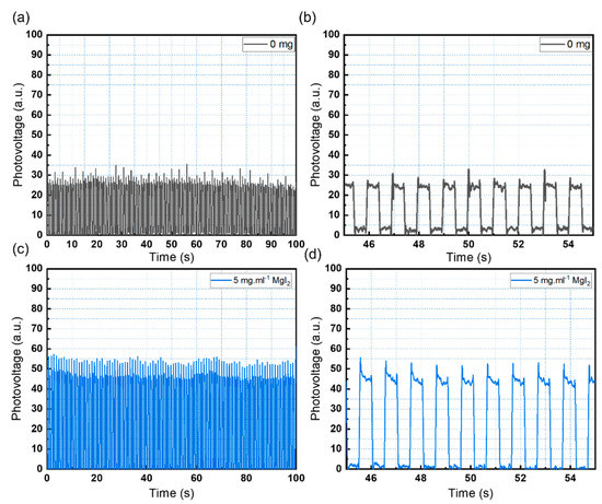 A vertical planar PET/ITO/SnO2/MgI2/CsPbBr3/carbon structure was used to investigate the photo-detection response of the CsPbBr3 photodiode. When light is absorbed by the perovskite layer, electron and hole pairs are separated. Electrons from the light-absorbing layer of the perovskite are carried into the conduction band of the perovskite, where they are injected into the SnO2 electron transport layer (ETL) and collected by the ITO electrode. To complete the electrical circuit, the carbon contact electrode collects the holes. Under a 0 V bias, the devices were tested with a pulsing white light LED at 1 Hz. Figure 5 depicts the devices’ consistent and stable response over time (a–d). The device’s response to the LED is consistent with the UV-vis and XRD data, which show that adding 5 mg·mL−1 of MgI2 improves sensor performance (Figure 5d).