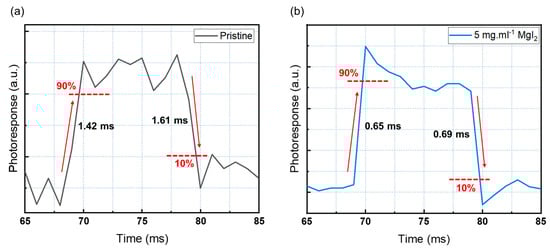 The response speed of a photodiode is an important metric that reflects its ability to detect a rapidly changing optical signal [10,11,46,47]. High-performance photodiodes used in SHM must respond quickly and consistently to light illumination. The response time was evaluated using the previously described method. Under ambient conditions, a 470 nm pulse light source from an LED was controlled by a function generator with square waves at a frequency of 50 Hz to measure response time [11,46,47]. The reaction times of pristine CsPbBr3 photodiodes and devices incorporating 5 mg·mL−1 MgI2 are shown in Figure 6. The devices demonstrated a consistent and repeatable response with excellent performance. Figure 6 depicts the response rise (τrise) and fall (τfall) times, which are the times it takes for a photodiode to reach 90% and 10% of steady-state values, respectively (a, b). The device containing 5 mg·mL−1 MgI2 has a rise and fall time of 0.65 ms and 0.69 ms (Figure 6a), which is comparable to previously reported devices [47,48,49,50] but significantly faster than the pristine devices (Figure 6b). Table 2 summarizes the response time of different inorganic perovskite photodetectors.