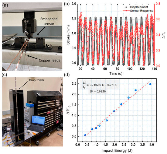 To investigate the sensor’s potential for impact sensing, an in-house drop tower testing setup was used to impact a composite laminate with an embedded sensor with varying impact energies ranging from 0.4 J to 4 J. To evaluate the sensor’s low-energy impact-sensing capabilities, impact samples were subjected to ten successive impacts of increasing energies. The strikes were delivered directly to the surface of the composite structure, right on top of the sensor. The impact testing setup is depicted in Figure 7c. Drop-weight tower impact testing is a popular and widely used method for investigating low-velocity impact in composites and ML materials. The impact energy can be altered by adding mass to the impactor or adjusting the drop height. For each impact, all device configurations produced distinct signals. As shown in Figure 7d, the signal peak intensity is proportional to the impact energy.
