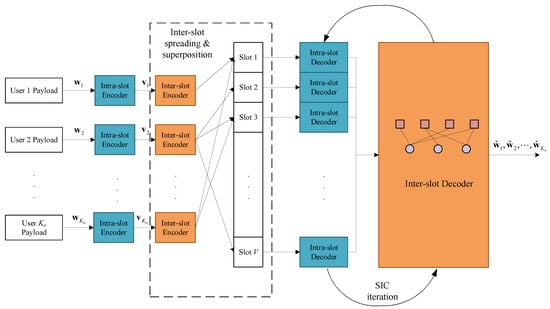 The payload of each user is encoded by the intra-slot code to produce , and then randomly repeated times to form an inter-slot packet-level spreading pattern. On the receiver side, the slot-by-slot intra-slot decoding is integrated into the packet-level SIC iteration process on the inter-slot factor graph. The intra-slot codeword contains the IDMA codeword with a CS pilot indicating both the intra-slot interleaving pattern and the inter-slot spreading pattern. The inter-slot code is an IRSA structure enabling the SIC. Thus, the proposed scheme is introduced under the above framework.