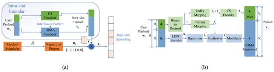 Finally, and are stitched together to form the whole packet of user l, i.e., . After assembling, the length of is . In general, the intra-slot encoder is common for every user. This not only keeps the simplicity of the encoding process but also ensures the common codebook requirement of unsourced settings. The ability of intra-slot code to distinguish superimposed user packets mainly comes from the compressed sensing pilot code and IDMA’s user-specific random interleaver, which are all dependent on the randomness of the pilot info slice . The whole structure of the intra-slot encoder is shown in Figure 2b.
