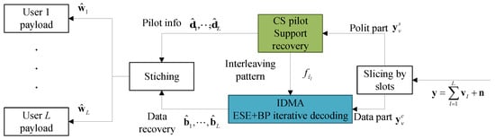 where is an 1-sparse vector with all-zeros elements except for position , and is an L-sparse vector, assuming no resource collision among users. By sending to the support recovery algorithm [29], the column index set of , as we modeled, the support set , is searched out. Remap the elements in back to decimals by aligning the -th column to . Then convert the decimals to length- binary sequences , which are the pilot info parts of user payloads. Besides, the interleaver patterns are recovered by selecting the -th pattern .