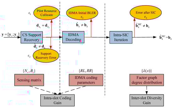Although, as described in Algorithm 1, the decoding structure consists of the compound intra/inter-slot iteration, it can nonetheless be regarded as a three-stage process when analyzing errors due to its successive style. The first stage is the CS pilot recovery, where the pilot resource collision occurs at the transmitter side and the support recovery error at the receiver side. The pilot plays three significant roles: the first part of the user payload, the user-specific IDMA interleaver, and the pointer used to reconstruct the packet-level factor graph. Thus, the pilot error will cause not only packet loss of its user but also the chain effect spreading to the correlated packets of other users. The IDMA decoding error and the remaining error after the intra-slot SIC process are both conditioned on the successfully recovered pilots. Then the modular errors are expressed as the functions of their corresponding coding parameters in (12).