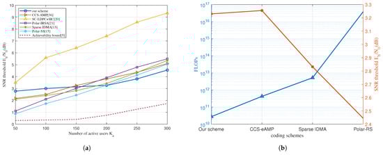 Based on the analytical framework proposed in [10], the FLOPf can represent the complexity of the decoder. For each encoding scheme, FLOPf can be expressed as a function of its coding parameters. We compare the proposed scheme with Polar-RS, Polar-IRSA, and CCS-eAMP, the expressions of which are listed in Appendix A. When comparing these schemes, it is insightful to investigate the complexity cost of the corresponding energy efficiency gain. Figure 7b shows the SNR level and the required FLOPf of each scheme when the number of users reaches 150.