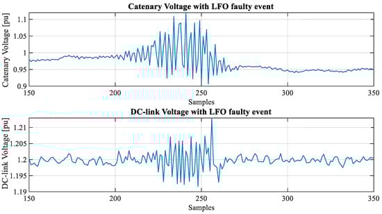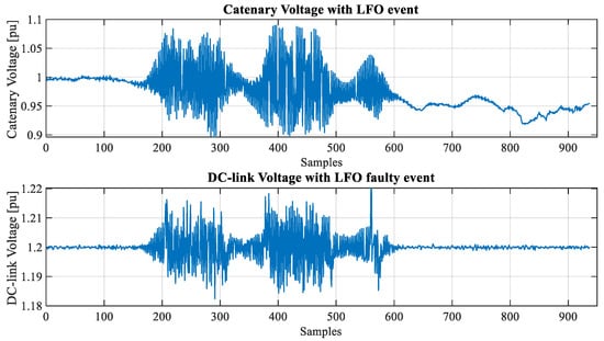 In this research, the data related to electrical variable measurements are down-sampled to several milliseconds. Moreover, instantaneous measurements are not available since sinusoidal signals were processed and stored as RMS values. Figure 5 shows a detailed view of catenary and DC-Link voltage in per unit with an LFO event.