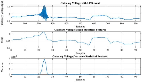 As a result, the number of samples for each variable in a log is reduced, and the number of features increased. That is why, for one event log, the initial raw data window of 29 variable (columns) and 937 samples (rows) is transformed into 237 features and 93 samples. Figure 6 shows the time series of a variable (catenary voltage) and some of the extracted statistical features (mean and variance).