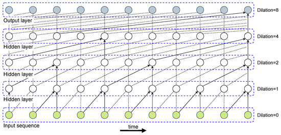 In this work, we extend the functionality of traditional 1D convolutional architectures by employing causal convolutional layers with dilations [51]. Inspired by causality’s notion that causal dependencies should coincide with the direction of time, the former convolutions apply causal filters for which their inputs can be only connected to future time steps in order to maintain the temporal ordering during training. Although causal convolutions are computationally easier to handle than RNNs, they require many layers to increase the area of the input sequence that affects a connected area in the output layer. Another issue is that very large kernel sizes are required to capture long-range dependencies, which might greatly inflate the computational cost. To address the previous shortcomings, dilated convolutions are introduced and have already shown outstanding performance for time-series forecasting problems [52]. Figure 3 illustrates dilated casual convolutions with dilation sizes 1, 2, 4, and 8 in a stacked manner that enables better generalization capabilities.