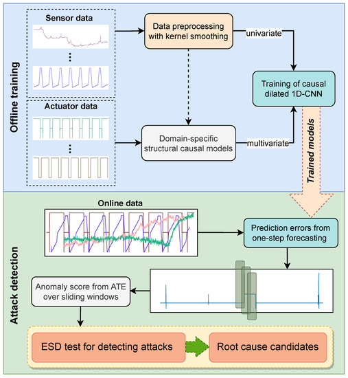 Overview of the proposed causality-inspired approach with offline and online phases. In the offline phase, training based on CNN forecasting generates both univariate and multivariate models. New data from sensor measurements and actuator states are used in the online phase to compute the ATE from the prediction errors over sliding windows. ESD test is finally performed on the aggregated sequence of the causal effect, first to detect anomaly status from incoming attacks, and second to indicate a set of the root cause candidates.