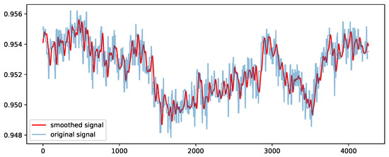 In the offline phase, we carry out a pre-processing step of the dataset. In particular, raw time series of each sensor values are normalized with a min–max scaler for squashing the values into the range of [0, 1]. This is mainly performed to avoid deterioration of the performance during training of the CNN models. In addition to min–max normalization, we likewise apply a kernel smoothing technique [53] on the sensor (continuous) values with a Gaussian kernel and a bandwidth of 40 samples that defines the spread of the kernel. A moderate size value of the bandwidth is selected since a very small size might incorporate high-frequency noise and a large one might eliminate essential patterns in the time series. Figure 5 presents the results of the kernel-smoothing method using an example of a sensor’s signal values from the SWaT dataset.