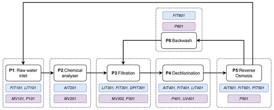 Process stages in the SWaT water treatment plant. Components that are enclosed in blue rectangles denote sensors, while actuators are enclosed in purple rectangles.