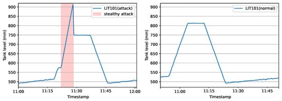 In general, most of the attacks are launched on the communication network before and after reaching the PLC, and specifically, on the sensor values and the actuator commands. Depending on the process stage and the number of attacked elements of the testbed, attacks are classified as follows: 26 Single-Stage–Single-Point attacks (SSSP); 4 Single-Stage–Multi-Point (SSMP) attacks; 2 Multiple-Stage–Single-Point (MSSP) attacks, and 4 Multiple-Stage–Multiple-Point (MSMP) attacks. Within the above-mentioned set of attacks, stealthy ones are also included, in which sensor values may be compromised in such a convincing way that the existing monitoring system is not able to detect them. Figure 8 illustrates a stealthy attack on the tank-level sensor from P1 (LIT101), while the right plot shows the temporal evolution of a normal filling/emptying cycle from the same tank. In particular, the red-shaded region signifies the limits of the launched attack in a stealthy manner, since as it is displayed, a slow increase of the water level takes place that finally leads to underflow of the tank.