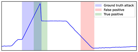 In the final evaluation, test records are classified either as “attack” or “normal”. Note that it is not necessary to explicitly define a specific threshold value for the anomaly detection, since ESD will either reject or accept the outlier hypothesis of the examined window in which causal effect from the prediction errors is estimated. Figure 9 illustrates an example of two segments that represent two “attack” predictions, with the ground-truth attack segment in blue. As we adopt a point-adjust scheme (or event-based), such as in [46,55], the green segment that overlaps the ground-truth attack is a true positive (tp), while the red segment that does not overlap the ground truth is treated as a false positive (fp). Lastly, false negatives (fn) represent the number of attacks that were missed.
