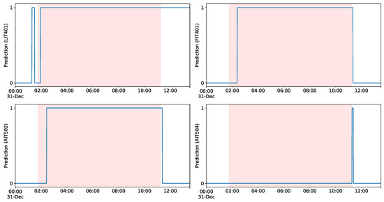 Within an ICS such as SWaT, it is naturally expected that strong interdependencies between various components are present, for which some of them may be correlational and others may be associated by causal relationships. Hence, it is of great importance to be able to flag the effects of an attack without having to incorporate the signal of the compromised component itself. An example of such a scenario is Attack 28, which is presented in Figure 10, via the predicted values of the corresponding univariate models. In particular, the shaded region shows the limits of Attack 28, in which the ultrafiltration feed-water pump is turned off by the attackers. Figure 10 shows that after a short period of time our detector predicts an anomalous state on sensory signals LIT401, FIT401, and AIT502. Interestingly, at the end of the attack, the univariate detector based on signal AIT504 (chemical analyzer) signifies an anomaly since the attack was successful, and the system takes immediate corrective measures by intervening with respect to the water’s chemical properties. After the attack, we notice that our model with level signal LIT401 correctly captures the recovery period, as it takes a while for the system to return to its initial normal state. Such a diagnostic scheme also enables experts to better evaluate the severity of and to ultimately understand the cascading effects of a launched attack in a CPS.