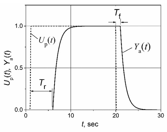 Unit pulse-response of the first-order plant Gp(s) = 1/(1 + s)) with the asymmetric response delay to the rising-and-falling plant-control signal Up(t). Tr = 5 s, Tf = 1 s. Ya(t) is the plant’s output parameter.