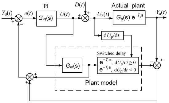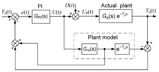 The principle of a Smith predictor for feedback-control systems with a response delay was proposed for the first time in [20]. The block diagram of the feedback-control system with the Smith predictor based on the PI controller is presented in Figure 2. The Yd(t) is the desired (set point) and Ya(t) is the actual value of the plant parameter, e(t) is the control error, U(t) is the controller’s output signal, D(t) is the load disturbance and Up(t) is the plant-control signal. GPI(s) is the transfer function of the PI controller, Gp(s) is the plant-transfer function and e−Tp s is the plant-response delay term. Gm(s) and e−Tm s are the transfer function and the delay term of the plant model used for the implementation of the Smith predictor, respectively.