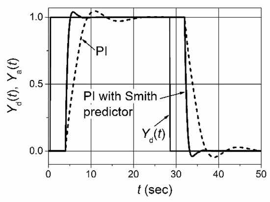 The transfer function (3) demonstrates that the delay term is excluded from the feedback system and exists as separate external block, which simply adds the delay Tp to the response of the plant-output parameter. This fact allows for the controller to be tuned more aggressively. Therefore, the employment of the Smith predictor for the feedback-control of the plants with a response delay allows for the decrease of the main dynamic parameter—the settling time of the control system. This fact can be demonstrated by the pulse-response of the feedback-control system of the first-order plant with a response delay (Figure 3). It is seen that the implementation of the Smith predictor allows for the reducing of the settling time significantly. This is because the employment of the Smith predictor allows for the use of the PI controller with significantly higher values of parameters Kp and Ki without worsening the plant-response quality. This can be created because the delay term of the plant is removed from the feedback circuit when using the predictor and the controller can be tuned, as in the case of a plant without the delay.