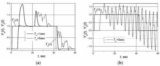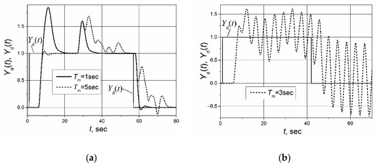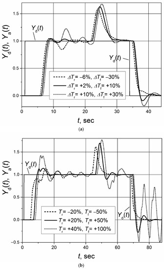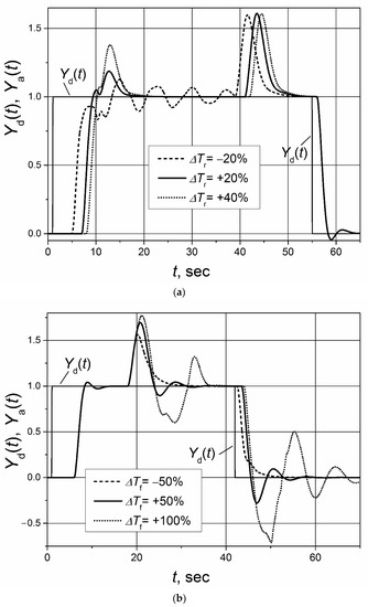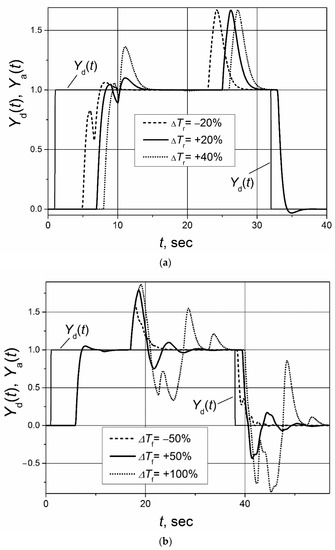 The obtained analysis results for the control system of the first-order plant are presented in the Figure 9 and Figure 10 and for the control system of the second-order plant in Figure 11 and Figure 12. They show that the change of the plant-response delay increases the settling time and overshoots of plant response and even that the system may start to operate in an unstable manner. When the plant’s response delay decreases, the increase of overshoots and pulsation amplitudes in the response transients is lower compared with the case when the response delay increases. Therefore, it can be concluded that the cases when the plant-response delay increases are more dangerous for the control system’s operation stability. It is seen that the analyzed control systems of the first- and second-order plants with the asymmetric response delay remain stable if an increase of plant-response delay to the rising and falling plant control signal ∆Tr ≤ 40% and ∆Tf ≤ 100%. If those limits are exceeded, the control system starts to work in an unstable manner (see Figure 10b and Figure 12b).