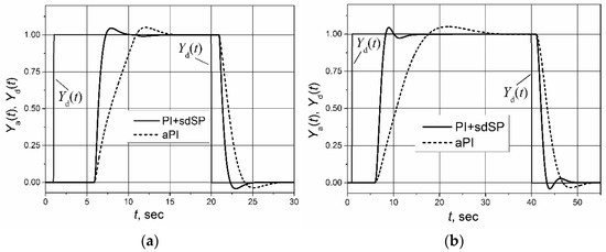 It is necessary to note that the aPI controller not only has a different control algorithm compared with the one proposed in this article, but it also has a different method of determining the switching moments of the controller parameters. The parameters in the aPI controller are switched at the time when the control error e(t) changes its sign, while in the controller proposed in this article the value of the delay time of the plant model Tm is switched when the sign of the plant-control signal time derivative dUp/dt changes. Furthermore, in the proposed controller there is no need to switch the parameters of the PI controller.