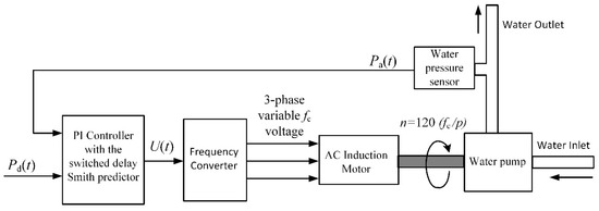 The proposed controller based on the switched-delay Smith predictor was investigated in a specialized frequency converter for controlling the speed of AC induction motors of water pump drives in domestic water-supply systems. The block diagram of such a water-supply system is presented in Figure 13. The purpose of the control system is to maintain the desired water pressure Pd(t), regardless of water consumption.