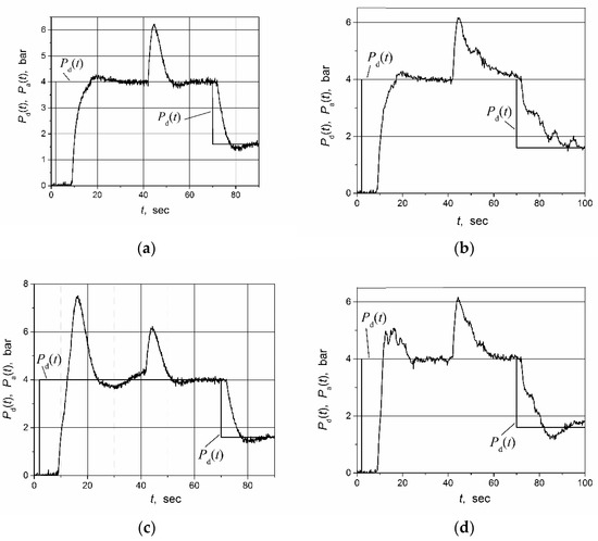 The water pressure set-point Pd(t) pulse (set point 4 bar step followed by drop up to 1.6 bar) and load-disturbance responses of the water-supply control system. The system is based on the PI controller with the switched-delay Smith predictor (a) and the classical Smith predictor (b–d). The delays in the model of the switched-delay Smith predictor were adjusted to values Tr = 7 s and Tf = 2 s, and in the classical Smith predictor to values (b) Tm = 7 s; (c) Tm = 2 s; (d) Tm = 4.5 s. The PI controller parameters in both control systems were tuned to values Kp = 0.85 and Ki = 0.57, the transfer function of the water-supply system model used in both controllers was Gm(s) = 1/(1.7 s + 1).