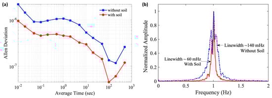 Figure 3a shows the measured Allan deviations of the 50-MHz beat note with (circle) and without the soil. Allan deviation characterizes the stability of a frequency source (the beat note in this case) under various time scales (i.e., the gate time of the frequency counter) []. Our result indicates that the addition of the soil layer leads to a near-uniform reduction of the Allan deviation across several orders of time scales. This suggests that soil is a broadband insulator with the ability to suppress both thermal (typically at low frequencies) and acoustic (normally at higher frequencies) fluctuations. Overall, with the 5-cm layer of soil, the average improvement of the Allan deviation across the entire measured time scales (0.01–500 s) is about 3.1 dB. In particular, the fractional frequency instability at a gate time of 1 s reduces from 1.07 × 10−6 without the soil to 4.58 × 10−7 with the soil, which represents a 3.6-dB improvement. Meanwhile, the spectrum of the beat note is measured by down-shifting the 50-MHz beat note to 1 Hz and inspecting it with the FFT DSA. The result is shown in Figure 3b. Again, the addition of the soil insulation results in the beat note linewidth reducing from 140 mHz to 60 mHz, a roughly 3.7-dB improvement, which agrees with the result from the Allan deviation measurement.