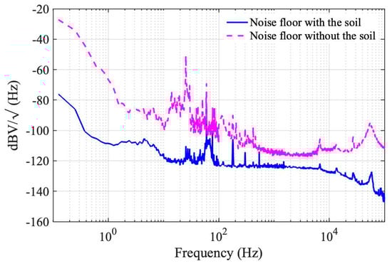 Finally, the noise spectrum of the interferogram is directly characterized by mixing the beat note down to the baseband under the quadrature condition and measuring it with the DSA. Figure 4 shows the experimental traces with and without the soil over a 6-decade Fourier frequency range (10−1–105 Hz). The result clearly indicates a broadband suppression of ambient noises by the soil. Especially, it has been shown that thermal-noise-limited fiber-optic sensing is achieved within a frequency range of 101–105 Hz [], which highlights the crucial impact of the soil insulation to the operation of the MZ-FP hybrid interferometer.