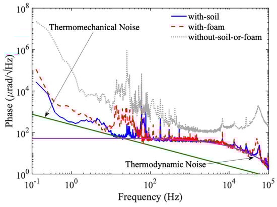 To further evaluate the potential of soil as a cost-effective insulation material, we have performed a comparative study between soil and polyurethane foam. Polyurethane foam is a standard soundproof material, with a thermal diffusivity ranging between 4 and 6 × 10−7 m2/s [] and a sound absorption coefficient of 0.9 (according to the manufacturer’s specifications). A second fiberglass chamber is constructed, where a 5-cm layer of polyurethane foam is adhered to the interior walls of all six sides. The MZ-FP interferometer is then transferred into this chamber, and the noise spectrum of the interferogram is measured to compare with the noise spectrum based on soil insulation. The result is shown in Figure 5. Additionally drawn in Figure 5 is the noise floor without either soil or foam, as well as the calculated thermal noise floors, including contributions from the thermodynamic noise and the thermomechanical noise []. These are theoretical predictions of the fundamental limits of interferometric fiber sensors due to intrinsic spontaneous fluctuations inside optical fibers []. The calculations of these noises are detailed elsewhere [].