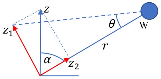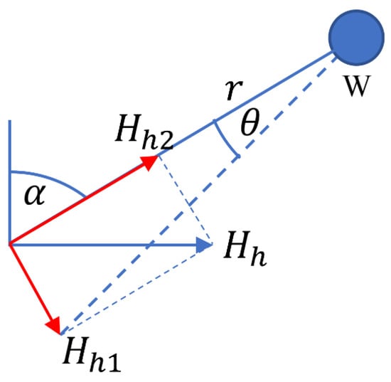 Horizontal Motion in the X direction. If the horizontal motion is in the X direction, the ground displacement can be decomposed into a component along the plane of motion of the W component seismometer, and a component perpendicular to this plane, as shown by the red arrows in Figure 1b. The component cannot cause the angle to change, while the component can be identified as the displacement in Equation (4). Therefore, Equation (4) becomes