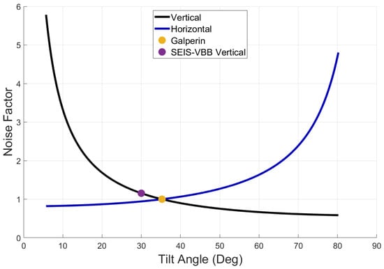 In Figure 4, both noise factors are plotted as a function of tilt angle. For the Galperin configuration (), both noise factors are 1. For the Very Broadband Seismometer of the Insight mission to Mars, and the noise factor is 1.15 in the vertical, which is exactly what Lognonné et al. (2019) reported.