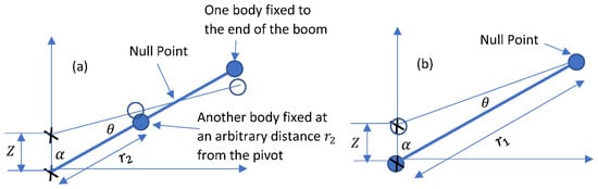 Now, consider the example shown in Figure 5, where there are two bodies of the same mass on a massless boom. This is the simplest example of distributed masses on a boom. One body is always at the end of the boom of length , while the other can be placed anywhere along the boom. We assume a variable distance between the center of mass of the movable body and the pivot. When the movable body is also at the end of the boom, the Null Point will also be at the end of the boom, such as in the case discussed before with point mass. However, when the movable body is moved all the way to the pivot, it will move up and down with the pivot, which is attached to the ground. It will not contribute to the deflection of the boom. In this case, the Null point will also be at the end of the boom, and not at the location of the center of mass of the combined two bodies.