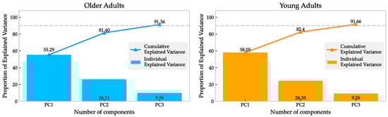 Figure 2 shows the values of the VAF of each group. Only 3 PCs of 18 joint torques were required to reconstruct the dataset with at least a VAF. In the case of the older group, the first PC accounted for of the cumulative variance, the second PC accounted for , and the third PC accounted for . In the case of the younger group, the equivalent values were for the first PC, for the second PC, and for the third PC.