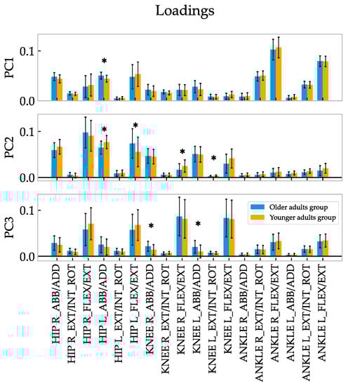 The PC loadings provide information on how the specific variables contribute to each PC. Analysis of the loadings showed a significant difference between the younger and older groups, as shown in Figure 3. The PC1 loading shows significant differences in the right hip abduction torques for both joints and the knee rotation for the right leg in the older group. In the case of the PC2 loading, differences were found between the loadings of the hip abduction moments for both legs and between the hip and knee flexion torques, showing lower values in the left (no dominant) hip moment for the older group. Furthermore, analysis of the PC2 values shows differences in the right knee flexion moment for the older group, where higher values were found. Similar results were observed in the case of the ankle abduction and rotation moments (see Figure 3). Analysis of the PC3 values reveals there were differences between the knee abduction moments for both lower limbs.