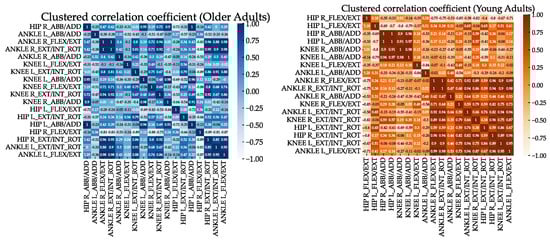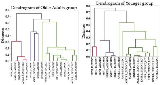 To assess the interaction between the different joint moments, the correlation coefficient between each pair of joint moments was used. This coefficient provides information regarding possible changes in the synergies during aging []. In that case, the absolute value of the correlation coefficient shows the level of coordination between each pair of joint moments []. Using this value as the similarity measurement, the coordination relationships among the variables were studied using the agglomerate hierarchical clustering method. First, the average of the absolute values of the correlation coefficient was calculated across all participants. Second, by applying the average linkage algorithm, the similarity between two clusters can be defined.