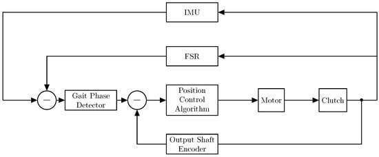 In this paper, out-of-plane torques were also included in the PCA study and thus may be considered to expand the synergy-based approach introduced in this document and further detailed in []. In such cases, there are two possible options for extending the actuation to out-of-plane motion and dynamics. First, by conducting a PCA study separately for the joint torques at each plane, which will yield a set of cams for each considered plane (in general, three sets for each selected PC and each leg). Although this may result in a more complex actuation system, it makes it viable to independently assess each actuation plane, increasing the number of selected PCs where needed. Second, by conducting a lumped PCA study on all planes, as conducted here, and developing a single set of cams, which will transmit forces to the joints via cables that are out of the sagittal plane. This latter option may yield a simpler actuation approach, although the variance accounted for might be lower for the first PC (given the larger amount of target variables), which means that the actuation might be less precise. Now, this must be considered when developing the control scheme and the pulleys/cams themselves. A more detailed analysis of a synergy-based design for wearable, assistive devices can be found in []. The general scheme to control the exosuit is depicted in Figure 7. The sensors used in the prototype for feedback were two IMUs on the leg, two force-sensing resistors (FSRs) on the heel, and an incremental encoder on the output shaft of the pulley. The gait phase detector used data from the inertial measurement units (IMUs) and FSRs to determine the current phase of the gait cycle in the sagittal plane and then sends the information to the position control algorithm. The position control algorithm additionally takes feedback from the output shaft encoder and sends the appropriate signal to move the motor and achieve the gait assistance required. The position controller also activates the clutches corresponding to the segment of the leg to be actuated.