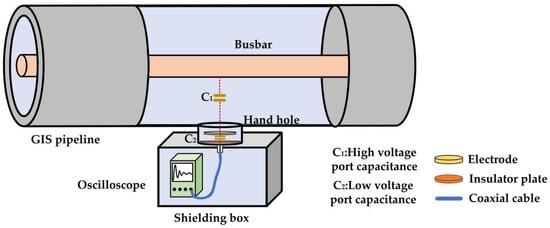 The capacitive voltage divider is the first part of the VFTO measuring sensor, and its structure is shown in Figure 1. It uses the stray capacitance between the hand-hole electrode and the high-voltage busbar to form high-voltage port capacitance and uses the stray capacitance between the electrode and the grounded hand-hole cover plate to form the low-voltage port capacitance. The handhole is equivalent to introducing a singular point into the uniform double conductor transmission lines structure of GIS where the wave impedance changes significantly. On the one hand, the smaller the diameter and depth of the handhole, the more conducive it is to reducing the interference of high-order mode electromagnetic waves on VFTO measurement. On the other hand, the larger the size of the hand-hole electrode, the more likely it is to generate significant fluctuations and oscillations on the electrode under the influence of parasitic parameters. Moreover, if the size of the handhole and electrode is too small, it is not conducive to engineering design. Therefore, it is necessary to reasonably design the structure of the capacitive voltage divider.