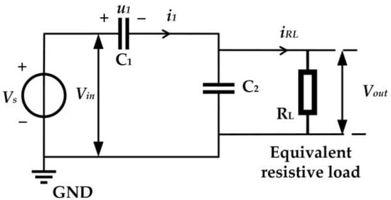 where  is the high-voltage port capacitance and  is the low-voltage port capacitance. Since the transfer function is independent of frequency, the capacitive voltage divider can be used to measure voltage signals of any frequency. However, the sampling equipment usually connected to the low-voltage port of the capacitive divider is equivalent to a resistive load, so the signal acquisition system based on the capacitive divider can be equivalent to the circuit shown in Figure 2. Therefore, the relationship between the output signal and the input signal of the VFTO measuring sensor satisfies the following formula:
