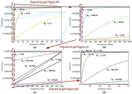 The Influence of frequency f and equivalent resistive load  on the ratio of input voltage to output voltage. (a) Equivalent resistive load  changes from 1 Ω to 10 Ω; (b) Equivalent resistive load  changes from 10 Ω to 10 kΩ; (c) Equivalent resistive load  changes from 10 kΩ to 1 GΩ; (d) Equivalent resistive load  changes from 10 MΩ to 10 TΩ.